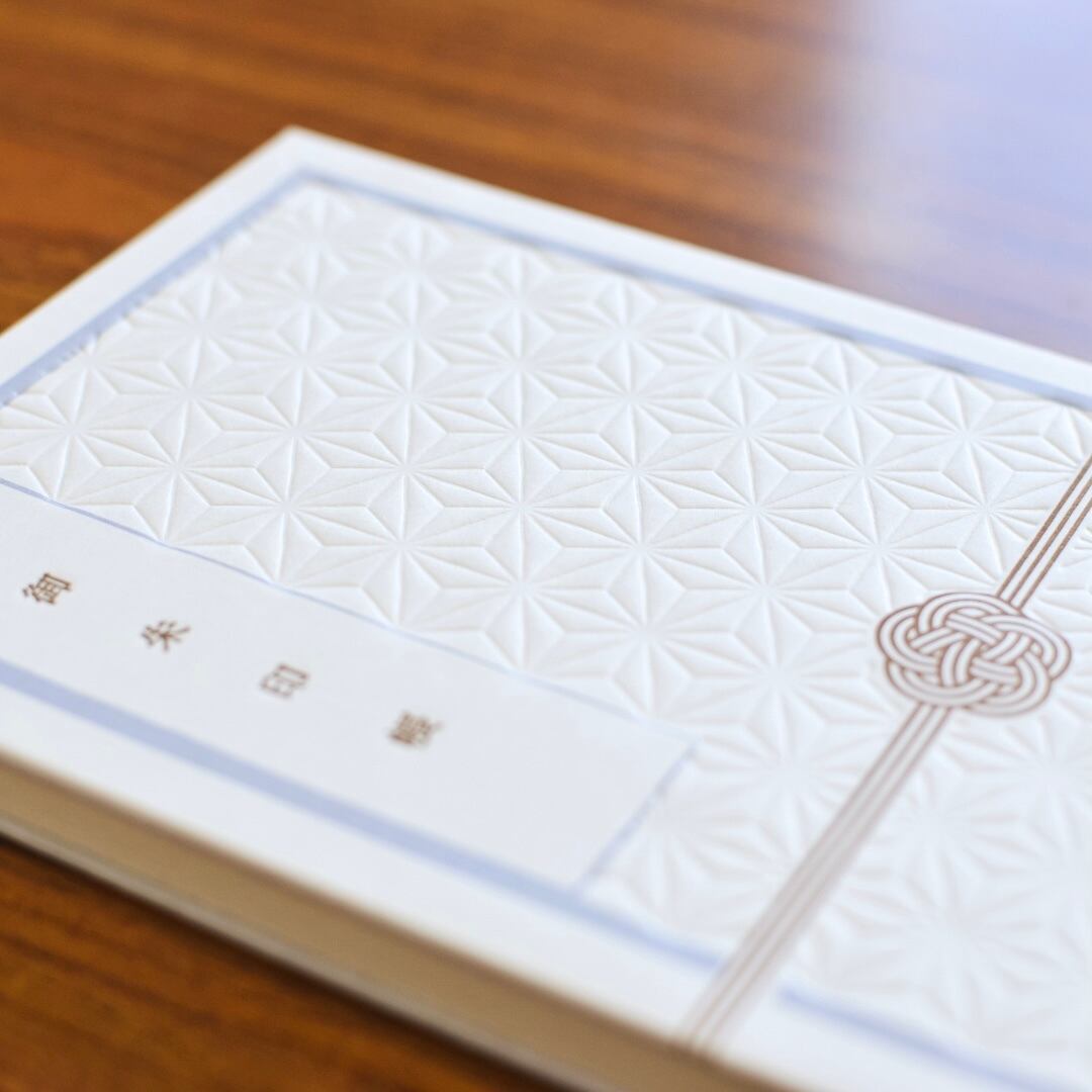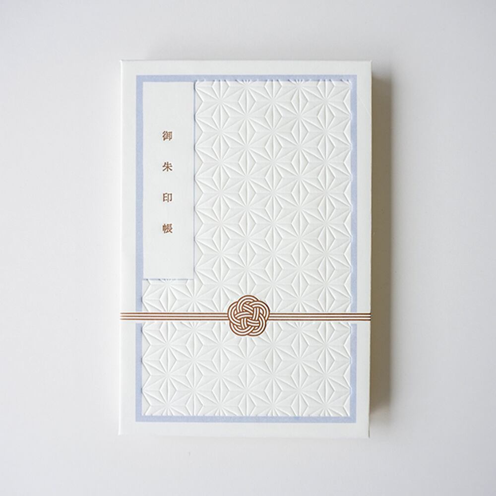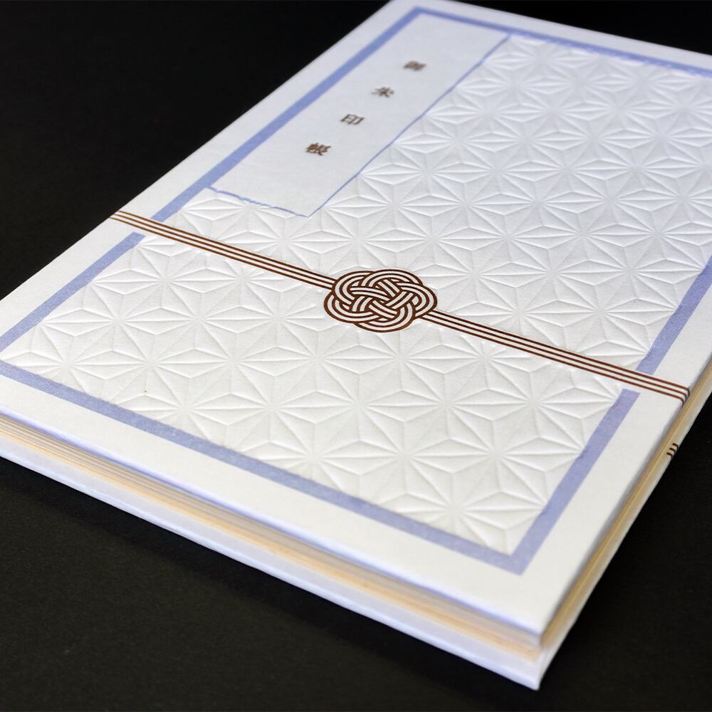 全体に麻の葉模様をインキをつけずに凹凸の影で表現し、活版印刷のルーツである活字をイメージした御朱印帳のテキストと、水引をアクセントにゴールドのインキで印刷しました。